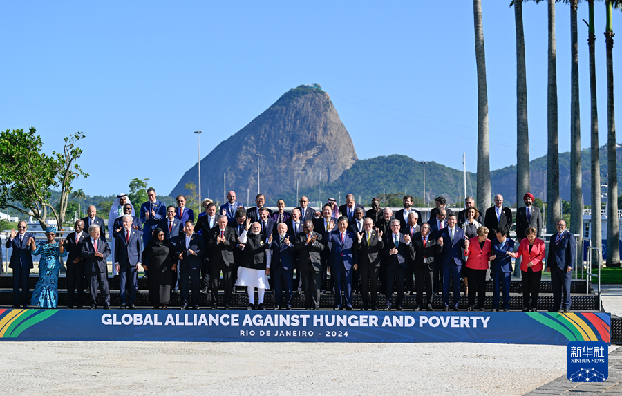 當?shù)貢r間11月18日上午,國家主席習近平在巴西里約熱內(nèi)盧出席二十國集團領導人第十九次峰會。峰會把“構建公正的世界和可持續(xù)的星球”作為主題,并決定成立“抗擊饑餓與貧困全球聯(lián)盟”。這是習近平同與會領導人共同參加巴方發(fā)起的“抗擊饑餓與貧困全球聯(lián)盟”合影。新華社記者 李學仁 攝