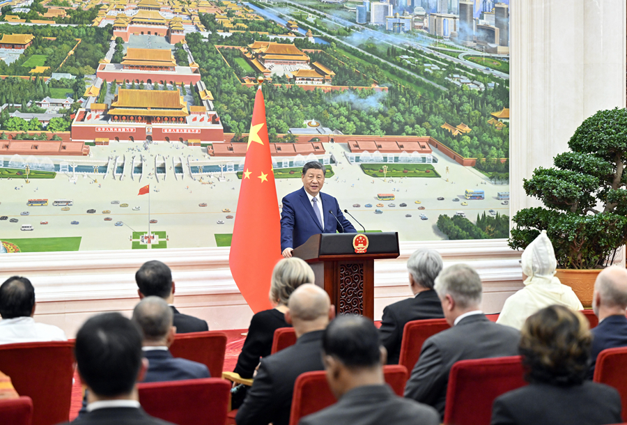 儀式結(jié)束后,習(xí)近平在北京廳對(duì)使節(jié)們發(fā)表講話。