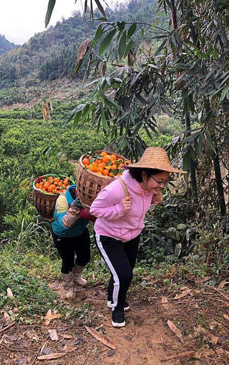 黃文秀與村民一起采摘運(yùn)輸砂糖橘(資料照片)。新華社發(fā)