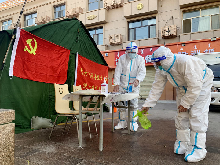 中共阿拉善盟委統(tǒng)戰(zhàn)部?jī)擅h員在額濟(jì)納旗一小區(qū)執(zhí)勤點(diǎn)消毒(2021年10月28日攝)。新華社記者 王靖 攝