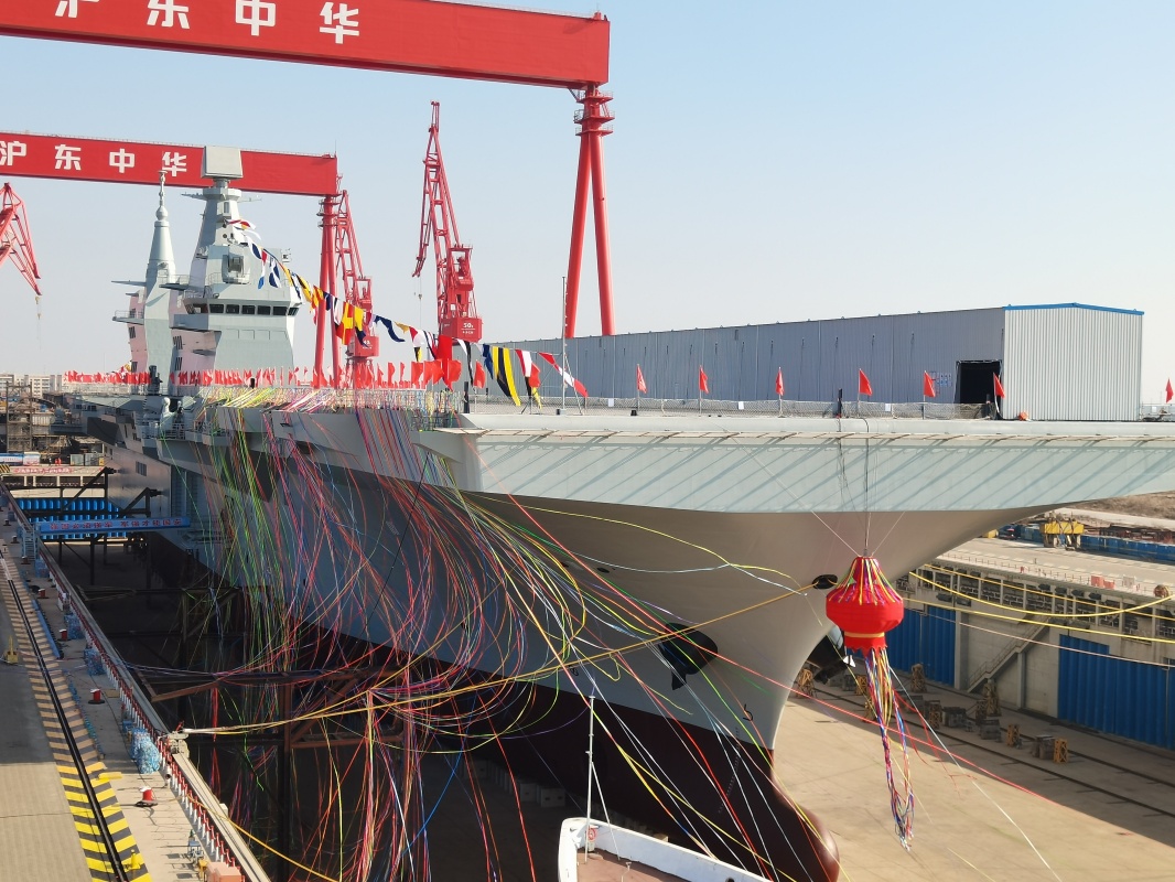 12月27日上午,我國(guó)自主研制建造的076兩棲攻擊艦首艦下水命名儀式在上海舉行。新華社發(fā)(蒲海洋 攝)
