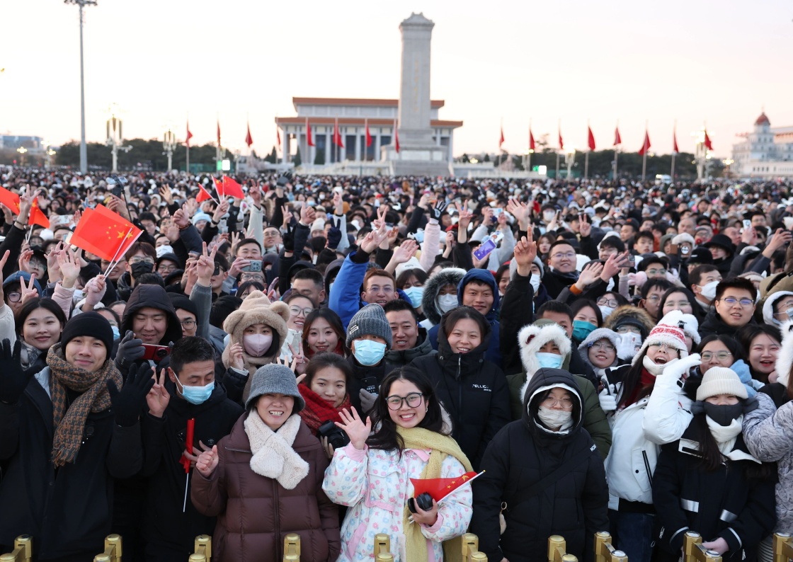 2025年1月1日清晨,北京天安門廣場舉行隆重的升國旗儀式。這是觀眾在升旗儀式結(jié)束后歡呼。