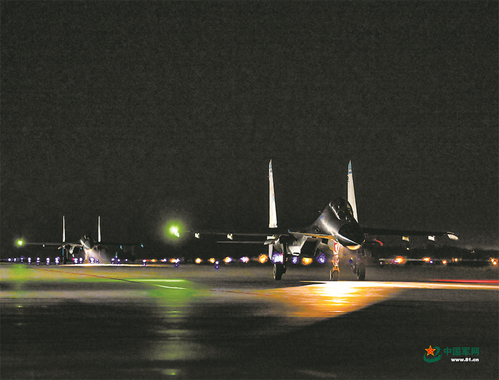 夜幕下,戰(zhàn)機(jī)滑出跑道。