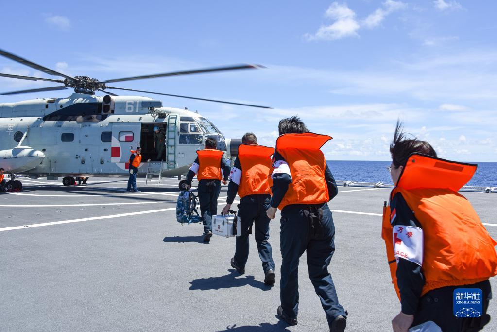 當(dāng)?shù)貢r(shí)間7月6日上午,中國(guó)海軍“和平方舟”號(hào)醫(yī)院船在西太平洋某海域開展全要素、全流程??樟Ⅲw醫(yī)療救護(hù)演練。這是醫(yī)護(hù)人員搭乘艦載直升機(jī)準(zhǔn)備離艦。新華社發(fā)(黎宇 攝)