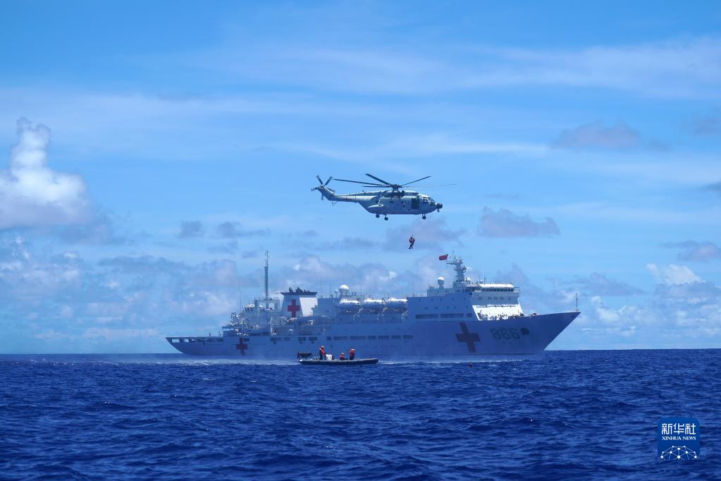 當(dāng)?shù)貢r(shí)間7月6日上午,中國(guó)海軍“和平方舟”號(hào)醫(yī)院船在西太平洋某海域開展全要素、全流程??樟Ⅲw醫(yī)療救護(hù)演練。新華社發(fā)(徐小龍 攝)