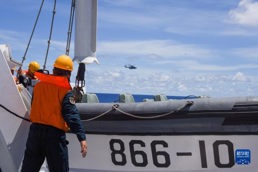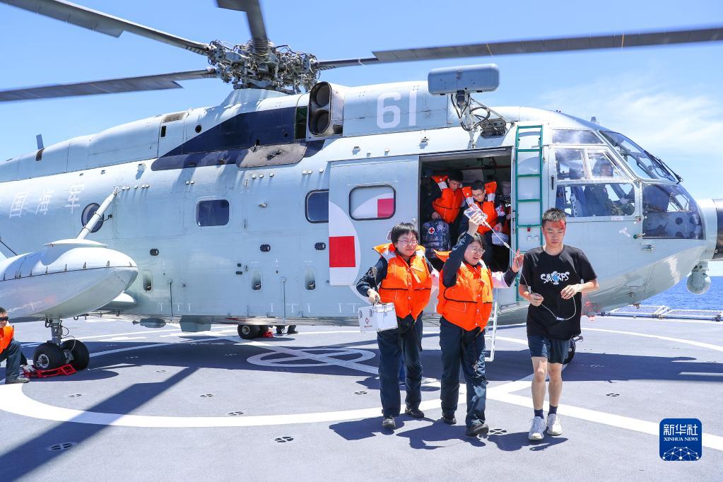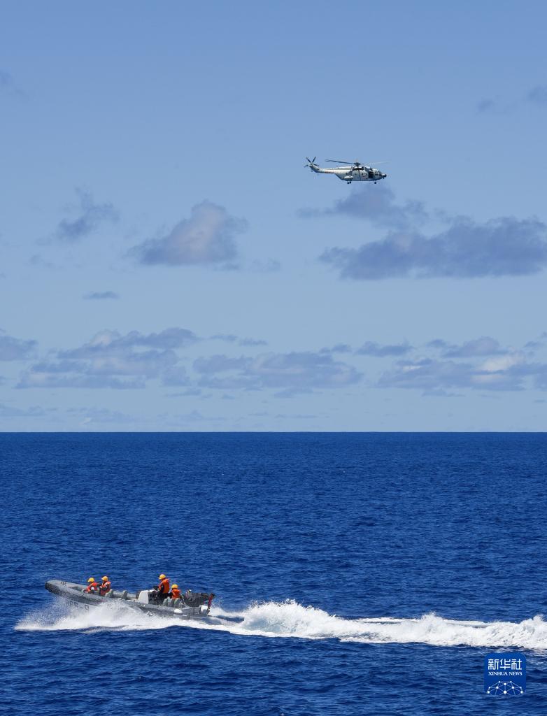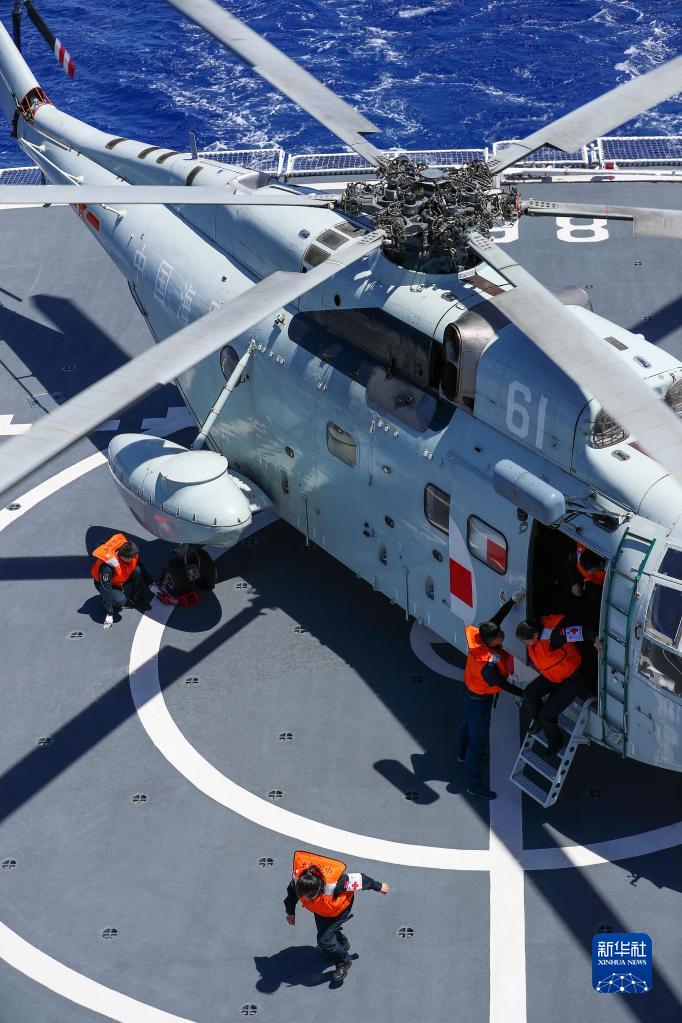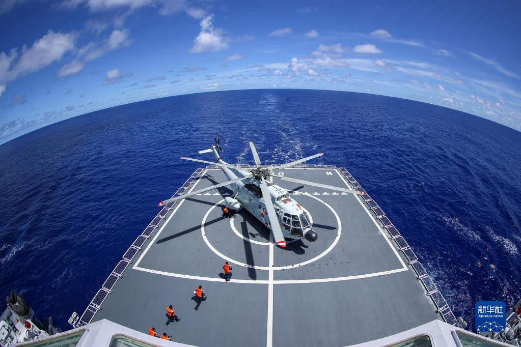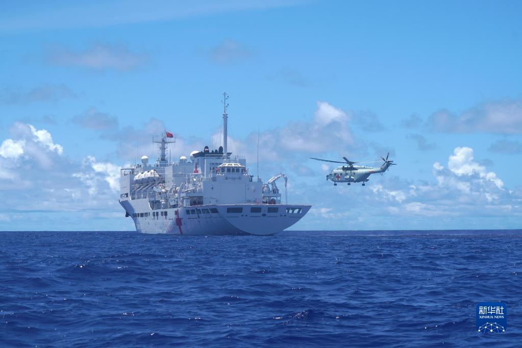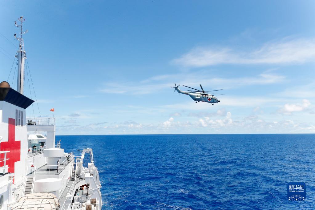 當(dāng)?shù)貢r(shí)間7月6日上午,中國(guó)海軍“和平方舟”號(hào)醫(yī)院船在西太平洋某海域開展全要素、全流程??樟Ⅲw醫(yī)療救護(hù)演練。這是艦載直升機(jī)離艦前出。新華社發(fā)(劉偉 攝)