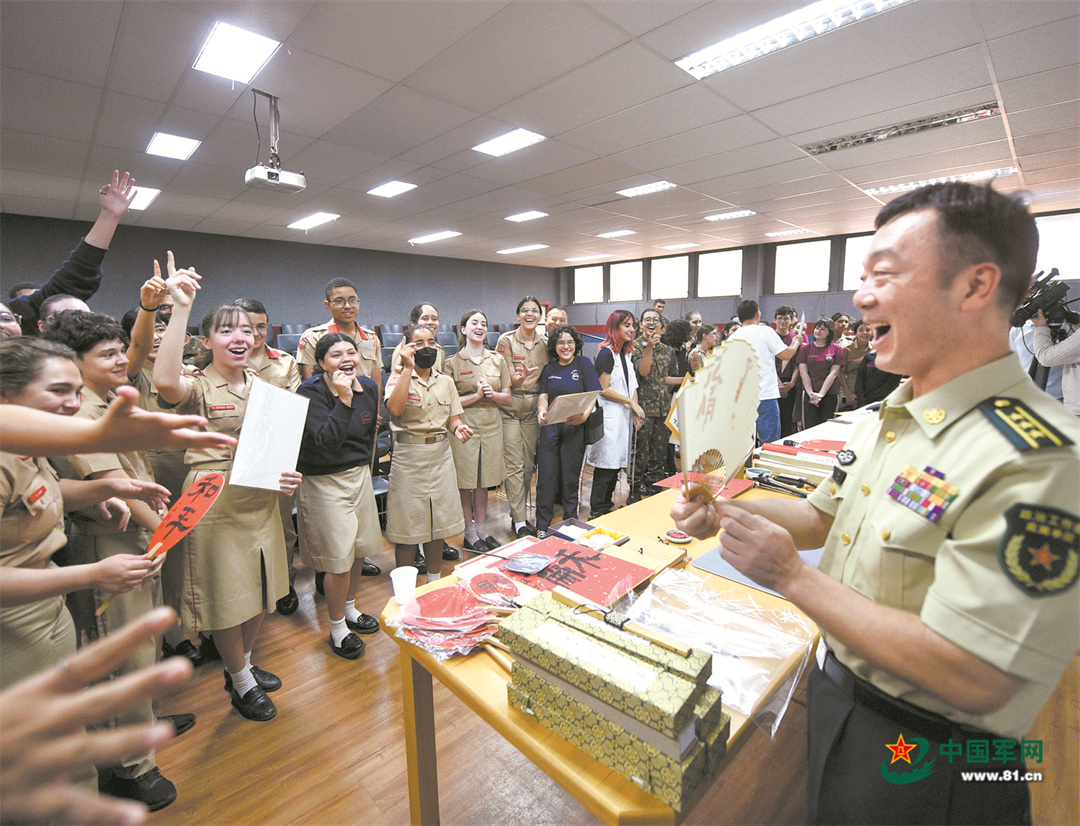 書畫創(chuàng)作員與巴西陸軍學(xué)校師生交流中國書法藝術(shù)。