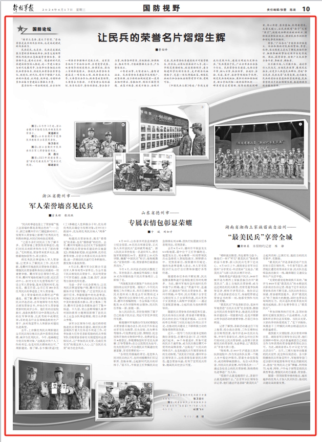 遇到重大災(zāi)情險(xiǎn)情,民兵常常沖鋒在前。湖南省軍區(qū)領(lǐng)導(dǎo)告訴記者,他們?cè)谡{(diào)研中得知,民兵普遍渴望自己的擔(dān)當(dāng)作為和獲得的榮譽(yù)能夠得到社會(huì)認(rèn)可。為此,湖南省將6月17日定為“民兵活動(dòng)日”。當(dāng)天,三湘大地舉辦隆重的民兵宣傳、紀(jì)念和慶祝活動(dòng)。各大影院播放民兵形象宣傳片,軍地領(lǐng)導(dǎo)登門走訪慰問家庭困難和有突出貢獻(xiàn)的民兵,懸掛“優(yōu)秀民兵之家”牌匾,利用報(bào)刊、電視、網(wǎng)絡(luò)、戶外電子屏等宣揚(yáng)民兵典型事跡,增強(qiáng)民兵的自豪感、榮譽(yù)感。