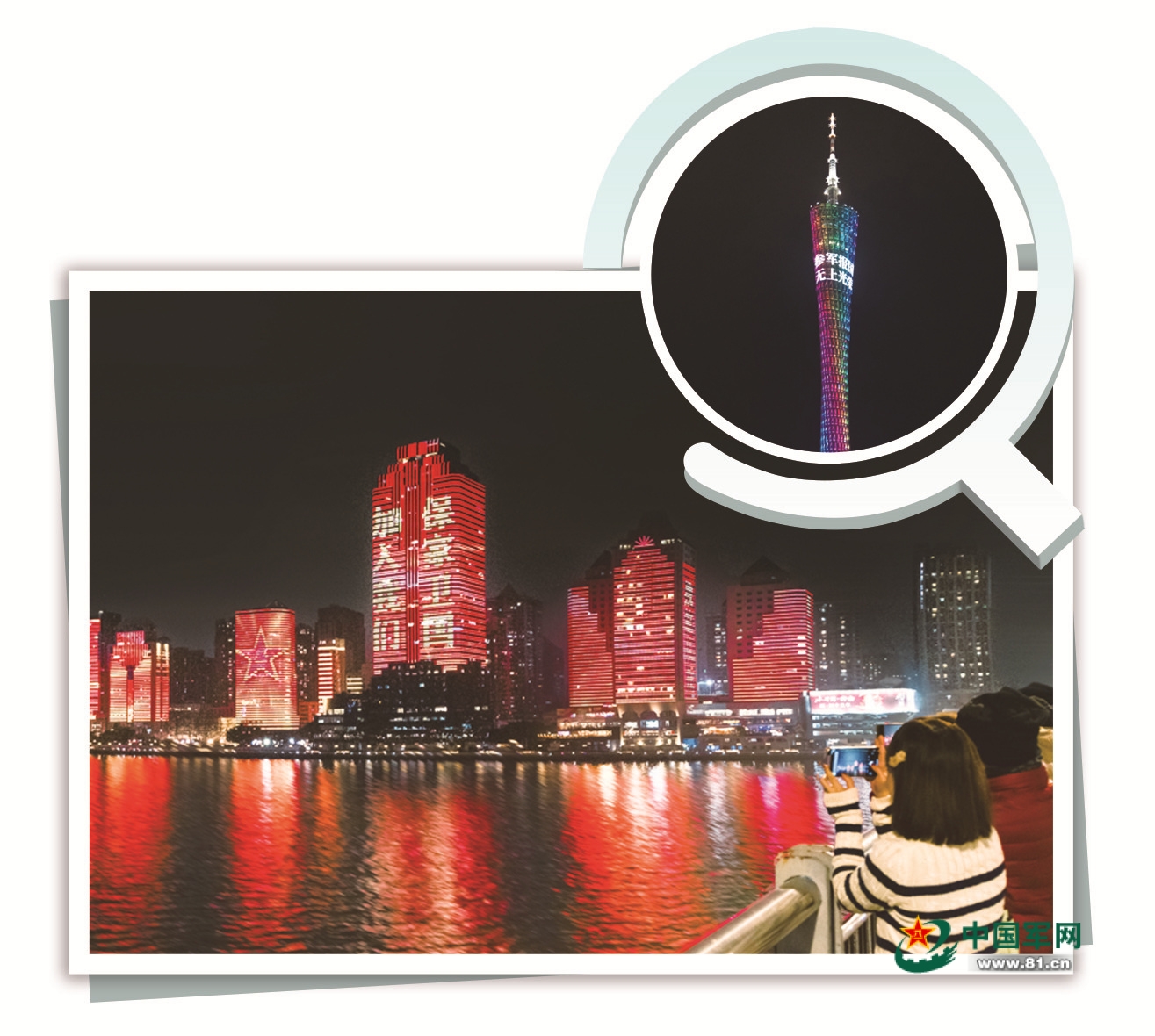 廣州市舉辦征兵主題燈光秀,城市地標(biāo)為國防點(diǎn)亮。陳美 攝