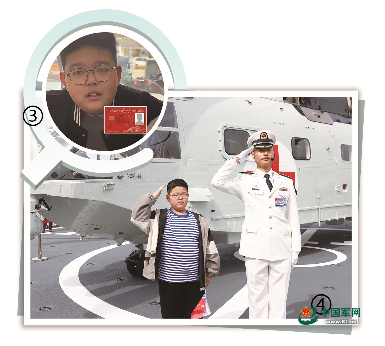 圖④:毛豆參觀海軍艦艇,與艦上官兵一起敬禮。劉再耀攝