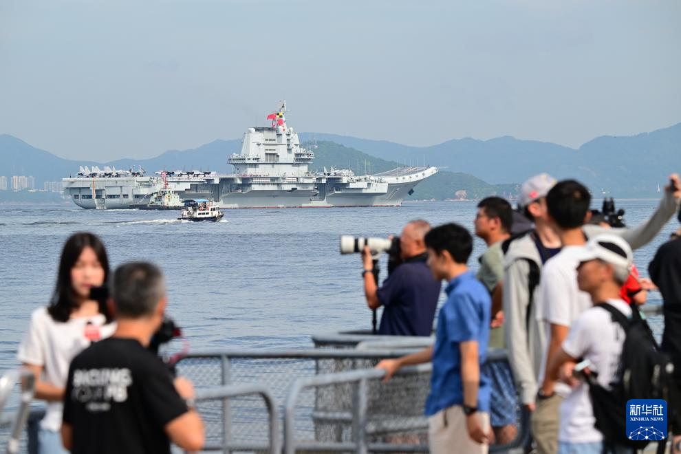7月3日,人們?cè)诎渡吓臄z海軍山東艦抵達(dá)香港。新華社記者 朱煒 攝