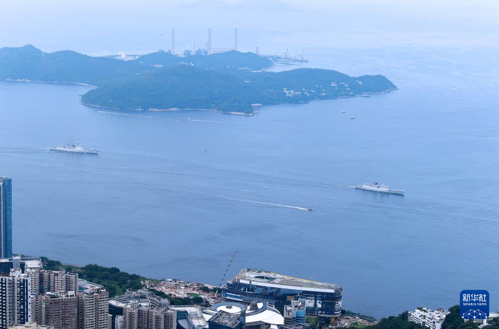 7月3日,海軍運(yùn)城艦(右)和湛江艦行進(jìn)在香港水域。新華社記者 陳鐸 攝