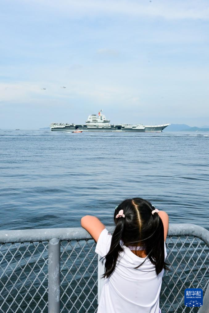 7月3日,一名兒童在岸上觀看海軍山東艦抵達(dá)香港。新華社記者 朱煒 攝