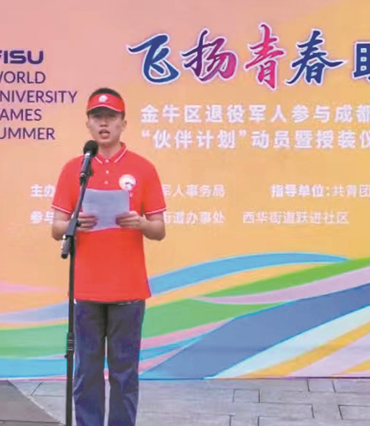 退役大學(xué)生士兵志愿者在成都大運會志愿服務(wù)“伙伴計劃”動員會上發(fā)言。