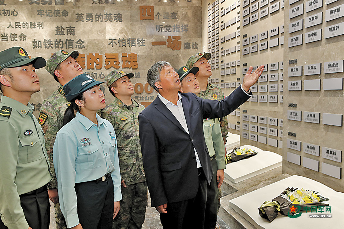10月10日,在五條嶺烈士陵園陳列館烈士姓名墻前,工作人員為前來參觀的鹽城軍分區(qū)官兵、文職人員講述烈士事跡。孫書林 攝
