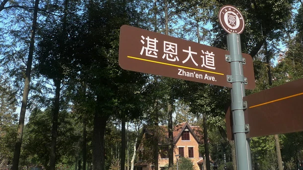 沿著湛恩大道前行,便來到了一片環(huán)境清幽、植被茂密的區(qū)域,樹叢間還可看見紅瓦屋頂與紅磚墻面。